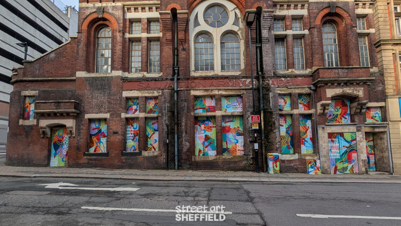 Artwork by Luke Passey covers the boarded up doors and windows of the abandoned Salvation Army Citadel on Cross Burgess Street. The artist has used vibrant block colours and featured ‘hidden’ letters that spell out ‘Peace Gardens’ in his mural.